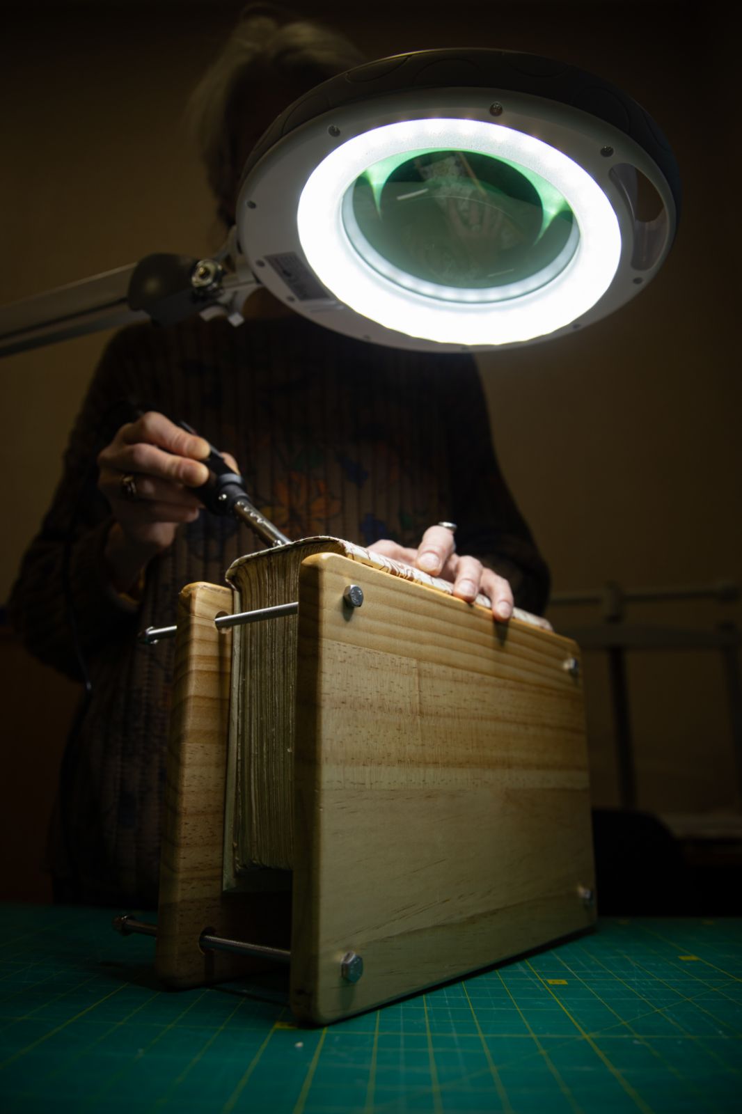 Geliefert wurden unter anderem eine Tischpresse, eine Lupenleuchte mit einstellbarem warmem und kaltem Licht sowie ein spezielles Mini-Bügeleisen. Diese Geräte ermöglichen eine präzisere und schonendere Behandlung der empfindlichen Objekte und tragen zur langfristigen Erhaltung der Sammlung bei.